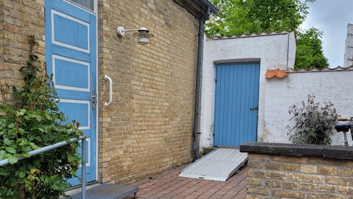 Hvis du er dårligt gående og bliver kørt til kirken kan din chauffør køre om til sognegården på Bispevænget 1. Her er der rampe til rollator og kørestol med adgang til kirken gennem den blå port.